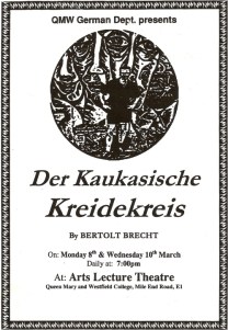 a second-hand bookshop in the Castro a couple of weeks back. Brecht’s Caucasian Chalk Circle (der Kaukasische Kreidekreis). One of my favourite (if not, my favourite) plays, one I have performed in German at university, back in the spring of 1999, at the same time that Kosovo was being torn apart. I co-directed a chaotic, ramshackle and very Brechtian version, in which I got to play the fantastic role of Azdak the judge. In those days I had a Beard to defeat all others. We had almost no set, and so I drew backgrounds of Grusinian buildings with Georgian graffiti over them, backdrops of hanged men, and great mountains, all on transparent cels using only four colours of pen, projecting them onto a white screen behind the actors using a bog-standard (and noisy) classroom overhead projector. For those actors who were gotten rid of for not coming to rehearsal, I recreated their characters in cartoon form and had them projected next to the real actors, even getting involved in dialogue. It was largely shambolic, but I have good memories of the other cast members, and it was great fun. And I think Brecht would have approved.