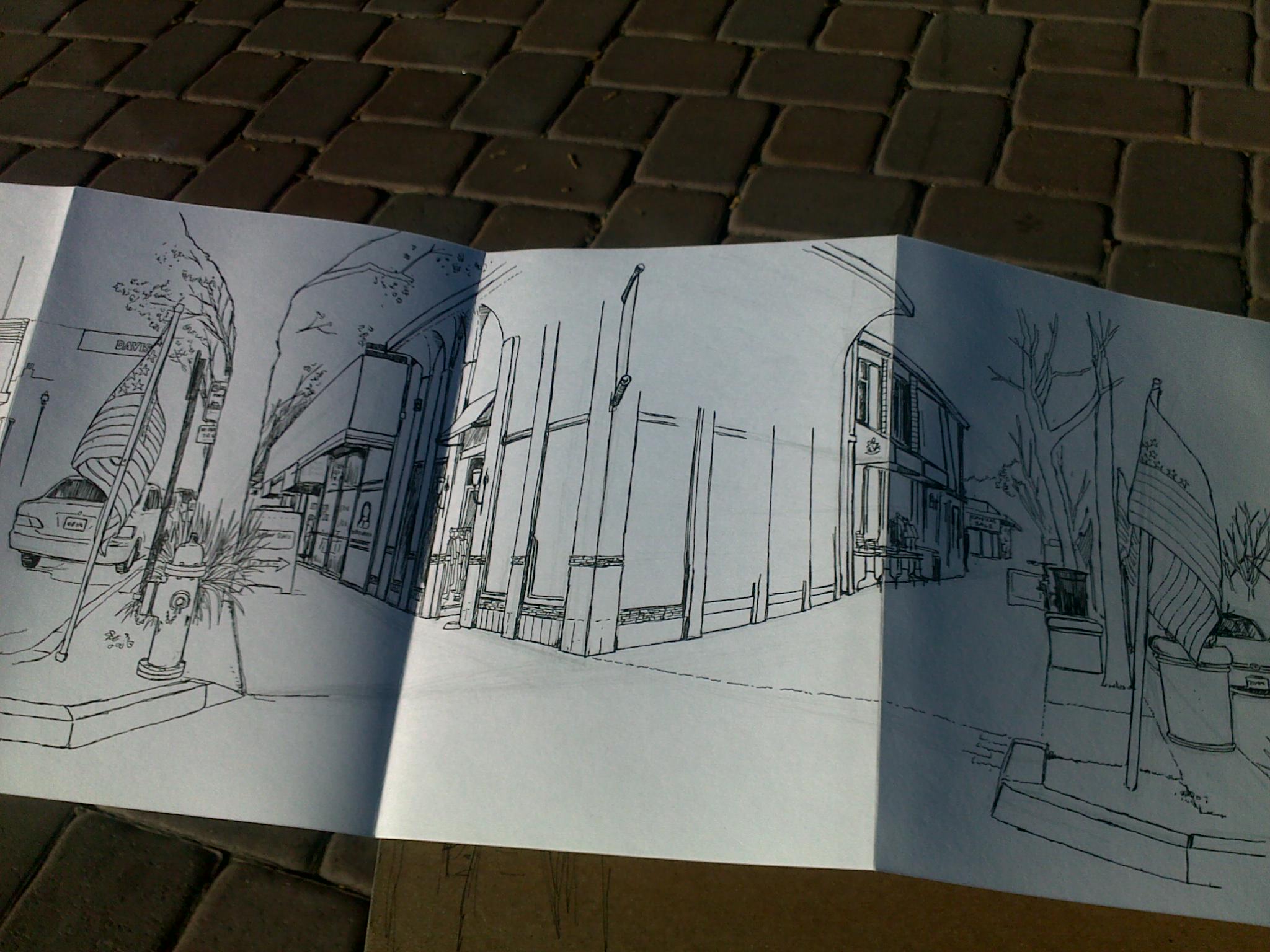 I spent the rest of the afternoon sketching down at 2nd street, a big panorama in another accordion sketchbook, but after two hours (and six pages, to be filled in and detailed later) I retired. Once it’s all done I’ll scan and post it, but the cold weather is now bringing rain with it so in the meantime, here’s a picture preview…