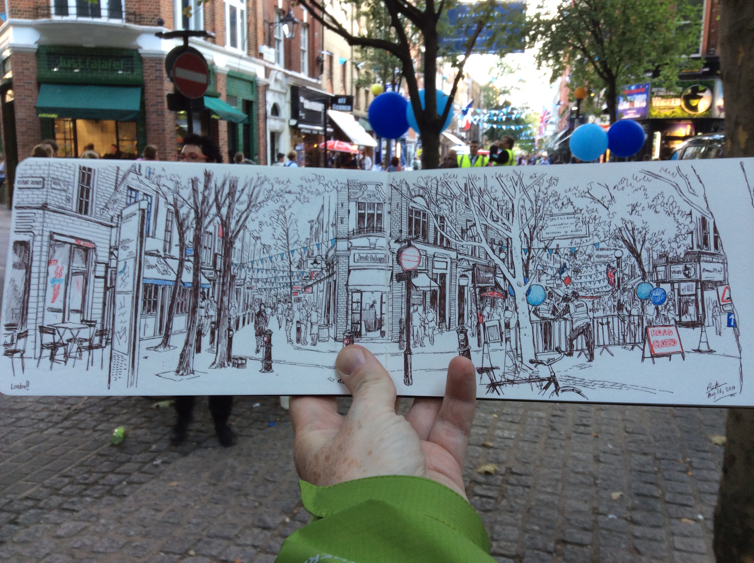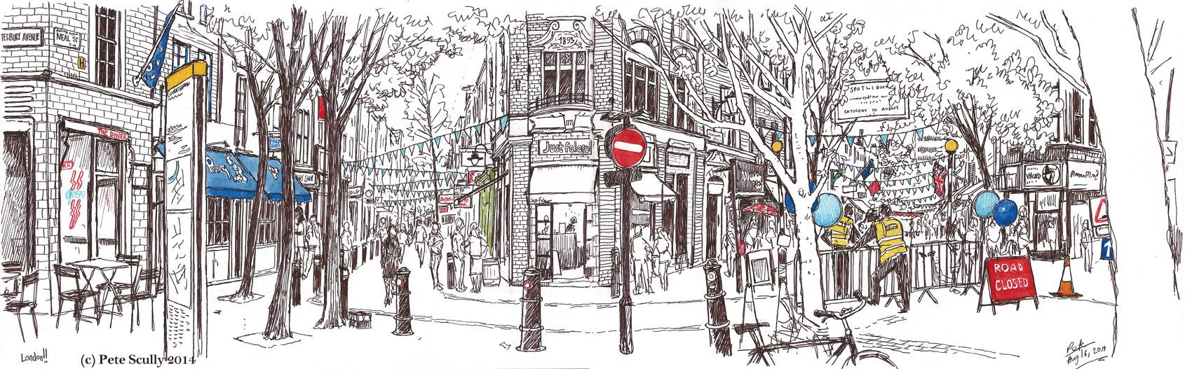 (To see a bigger version, click on the image, or just move the screen closer to your eyes). It was a Saturday in the middle of August, and it was LONDON, and I was going to meet up with some old friends for a night out. So I went down to London a few hours early to clock another panorama into the sketchbook. This turned out to be my last London panorama, not getting another opportunity in the days before I flew back to America. I’ve wanted to sketch down this way for a long time, but it’s a complicated setup of streets. This is just off of Shaftesbury Avenue – the St.Giles / Covent Garden end, not the Soho / Chinatown end – where it meets Neal Street (on the left) and Monmouth Street (on the right). Monmouth Street then meets up with Seven Dials and all hell breaks loose, honestly. It’s a complicated labyrinth and one of my favourite parts of the capital. I used to dash through here on my way from the 134 bus stop to my Medieval English classes at King’s College. On this day there was some kind of festival going on down at Seven Dials with music and balloons and a food cart here or there. I stood on the corner and sketched as much as I could, occasionally giving directions to tourists (have you maybe wondered why several of my London sketches are done standing next to those handy maps with the yellow top that are dotted around the city? It’s because I can’t remember enough to give directions any more…). One young lad, an American, did stop and ask me, “Say do you know where I can find a pub to watch the Arsenal game?” Well you’ve asked the right person! I beamed, and gave him directions to a pub I knew would be showing Spurs. Not really, I didn’t really. As I say, I don’t know the answer, so I just sent him to the Intrepid Fox, a pub I know had actually closed down years ago. No, no I didn’t do that really either. I actually waved my finger Obi-Wan style and said “You don’t want to watch Arsenal. You want to go home and rethink your life.” Ok so back to the sketching. The two yellow-jacketed security guys on the right, they kept coming over to have a peek at my progress. So, I just had to add them in. Even though they’re impossible to make out who is who they both said “that’s me! that’s me!” and were very excited about that. One thing I like about doing panoramic pictures like this, you aren’t drawing a picture of something specific and small details can be a lot of fun, and when they are people they usually blend in and are generic but occasionally they can give a sketch an anchor, something to literally draw us as humans into the scene. Also, and more importantly, it meant I didn’t have to attempt to draw the stuff that was happening in the street ahead, so I was glad the guy was leaning on the barrier at that moment. This took me a couple of hours, including time for phone calls with friends, and I did manage one more sketch before meeting up for dinner. Here though is the map of where I was when I sketched.