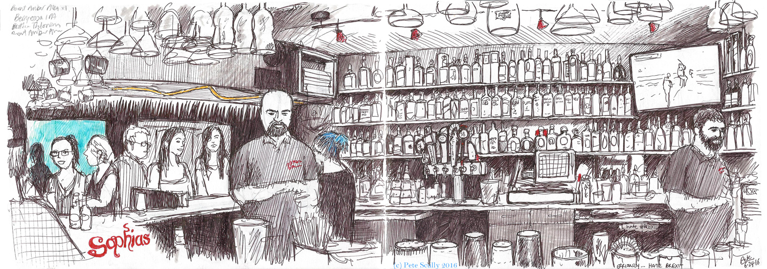 Last Friday, I really needed to go out and sketch away my frustrations with the day’s news by doing a complicated drawing of a bar, and having a few beers while I was at it. I’ve sketched all of Davis’s bars now I think (except ‘Our House’, I’ve never sketched there) and wasn’t sure which one I wanted to draw. I nearly went back to City Hall Tavern again, (they had kindly posted something about my sketches on their Instagram account the day before), but I hadn’t been to Sophia’s bar in quite a while (a year and a half at least) and I always like it in there, the people are nice, so that’s where I went. I go to the attached restaurant pretty regularly, Sophia’s Thai Kitchen. It’s my favourite food in Davis. I have sketched this bar a couple of times before, both while sat further back from the bar and focusing more on the colours and contrasts, but this time I wanted to tackle sketching those bottles. Sophia’s has Brother Thelonious on tap, which is probably my favourite beer in the US, though you can’t drink too much of it. The Giants were on the TV; the Giants are always on the TV when I bar-sketch. You can click on the image for a closer view. I drew this in the Seawhite of Brighton sketchbook (the one I started in Santa Barbara) with the brown-black uni-ball signo um-151 pen, and it took me, I don’t know how long. Three beers I think. I had a couple more for luck. I kept the colour to a minimum but did add a block of blue highlighter for that fish-tank thing. Also blue for the bartender’s hair, you know I can’t resist sketching blue hair. And so, another bar sketch. See my others…