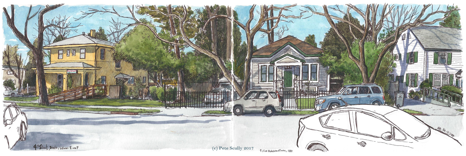 This is the stretch of 4th Street, Davis, between E and F. These grids seem like a game of Battleship sometimes. You could probably play Battleship on a US city map. “A-2nd!” “Aw, you sunk my SUV.” Actually a Davis version of Battleship would have bikes and double-decker buses. And skateboards too, we have lots of those. It’s like Hill Valley. I saw someone on one of those motorized skateboards the other day. No, not those rubbish hoverboards with the glow beneath it, I mean an actual skateboard, but with the wheels moving by motor. Now, the white house on the far right (dammit, I hope this won’t come up in internet searches of ‘far right’ and ‘white house’, I’m sure there are many) is Cooper House, I have drawn it a few times before. The large yellow building on the left, hiding behind the tree, I don’t know if that is anything special but it houses an electronics company now, I think, I don’t know. I promise I’m not fake news, and I’m certainly not fake sketches.Anyway the small house in the middle, now that one is the historic building known as the “First Presbyterian Manse”, at 619 4th St, and this was built in 1884. 1884! That is a pretty old building for Davis. It is in the ‘Classical Revival’ style, and looks goshdarn good for its age. The first person to live there was Rev. J.E. Anderson. Remember I mentioned Hill Valley from Back to the Future, well when Marty and Doc were sent into the Old West, that was 1885. If Davis were Hill Valley, and Hill Valley is meant to be in the general part of California, then this house would have been there. This is from cowboy times. “Cowboy Times”, haha, that sounds like the sort of newspaper that would be allowed into WH press briefings. Well, this is the latest in my two-page panorama sketches. You can click on it to see it embiggened. If you’d like to see more such sketches, go to my Flickr album ‘panoramas’: https://www.flickr.com/photos/petescully/albums/72157647926718773
