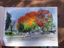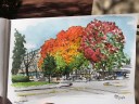 Tonight (January 3rd) it is raining here in Davis. It’s the first proper rain in ages, it feels like. Of course all I’m worried about is whether the city fields will get closed for our soccer practice this weekend (I hope not). It’s been a pretty dry spell. But that is now. My lack of posting sketches lately means I am still going back in time, this time back to mid-November, when the trees outside Hutchison at UC Davis were ablaze with oranges and reds. A lot has happened in the world since then. The Last Jedi came out, for example. I’ve seen it twice, and need a third time to really get my feel for it, but I will delay discussing it here until that third viewing, but not because I want to approach it like a conscientious and objective critic, but because I want to wait until I have some Last Jedi Lego sketches to go with it (and yes, I have some Last Jedi Lego, the old Luke and Rey training set (with a Porg) is sat on top of the scanner right now). So sorry, it’s going to have to wait. It doesn’t feel right to post about it under a picture of some trees from a month and a half ago. But what can I talk about instead? Foliage? I could talk technique I guess. For this sketch, I actually added the paint first, and then added pen lines over the top. Whoah there Scully, what the fuh? Since when was that a thing you do? Well you know what sometimes I like to mix it up a bit, live a little, not just do exactly the same thing over and over like a scratched record. I’ve not done it since (I’m not that adventurous you know) but I did take a couple of pics at the time wile sketching that I thought you might like to see, below. It’s not exactly a ‘step-by-step’ but it’s to the point. Maybe some day I will do more ‘step-by-step’ type posts, even a video or two, but those usually slow me down a lot, which is why I never think to do them. Now at the October ‘Let’s Draw Davis’ sketchcrawl (have I posted about that yet? I’m so behind!) I did do a little sketching demo for the gathered group of sketchers before the ‘crawl began, demonstrating how to sketch a fire hydrant. When I say ‘demo’ I mean like an example of how I do it, not like a protest march with banners and stuff, though I would do that too.