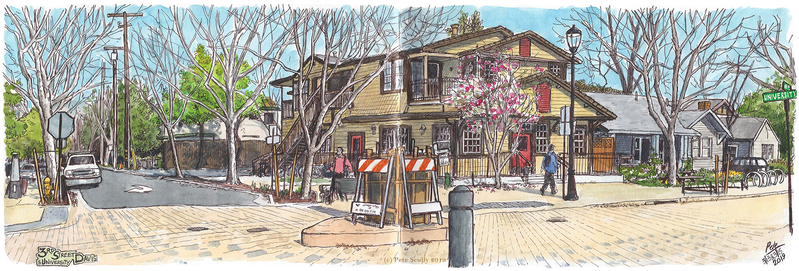 And finally, time to rest. I left the bright late afternoon and walked into Specs, one of my favourite spots in the city. At first I though it was closed, all the lights were off, but it was just much darker than outside and it took a while for my eyes to acclimatize to the dim lights in there. It’s full of stuff, and a few characters. I ordered a pint of Anchor Steam, took a seat with a view and started scribbling in my book. I read for a little (amazingly I could see really well after my eyes got used to it), reading some of those travel stories, and then drew these two fellows at the bar in pork pie hats. Or bowler hats, I don’t know, I’m not a hatologist. I enjoyed drawing this. It’s very different, much more of a reaction to the low light than a line-for-line interpretation; I’ve done that already. I’ve sat on this seat before, years ago at the end of a night out with my friend Simon, we played chess (drunkenly, he drank whiskey and I drank beer). Seven o’clock approached, the long journey back to Davis beckoned. I really love coming to the city, especially this area. I have plans to do a historical sketchcrawl down here sometime in the next couple of months, I have thought about it for a couple of years now. There is a lot to discover. Just around the corner, for example, on the very next day, March 24, City Lights Books was celebrating the 100th birthday of Lawrence Ferlinghetti, famous local Beat poet and co-founder of City Lights. A hundred years old, can you Beat that!