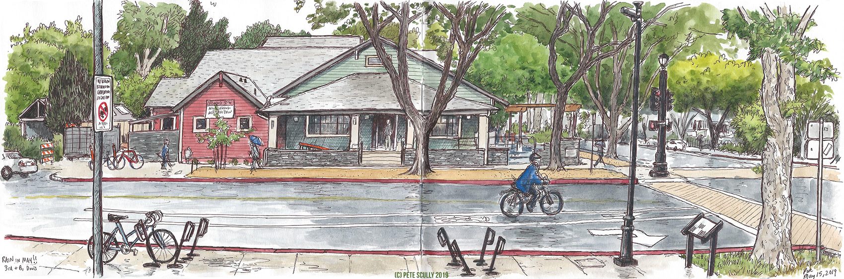 Rain has returned for a bit, a surprise at this time of year. More is coming. Not too much I hope. Anyway this week I decided to finish off Sketchbook #32 (my numbering of my panoramic sketchbooks brings us to this number) with a two-page spread of the corner of 3rd Street and B Street. I last sketched this corner over a year ago on a rainy March day, stood as I was this day beneath the entrance of the US Bicycling Hall of Fame. I think it will be a restaurant. Another changing corner of Davis. 3rd Street has had quite an upgrade from this corner down to the University, this week getting a bit of a celebration (that I didn’t go to). Click on the image to get a closer view (or just put your eyes really close to the screen).