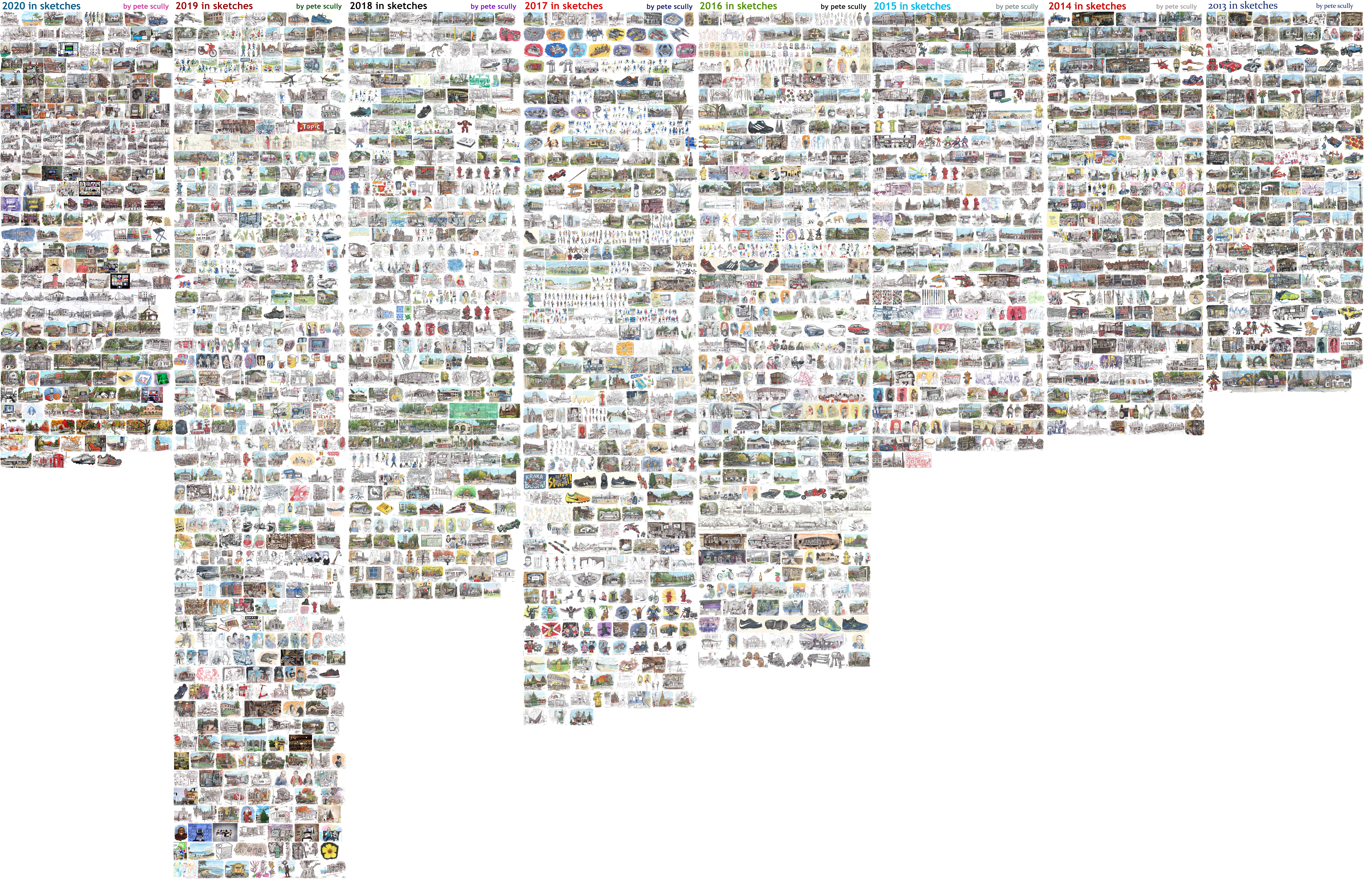Here are the comparisons year by year from 2013 to 2020. I was not surprised that 2020 was about half of 2019, but didn’t expect it to be on a par with 2015, for example. My goal for 2021 is just to match 2020, in some way, beat it if I can, and maybe to try and learn something new, bring something more to my sketching. Or just do what I can to stay sound of mind. If I have times when I just cannot draw, that’s fine too.
