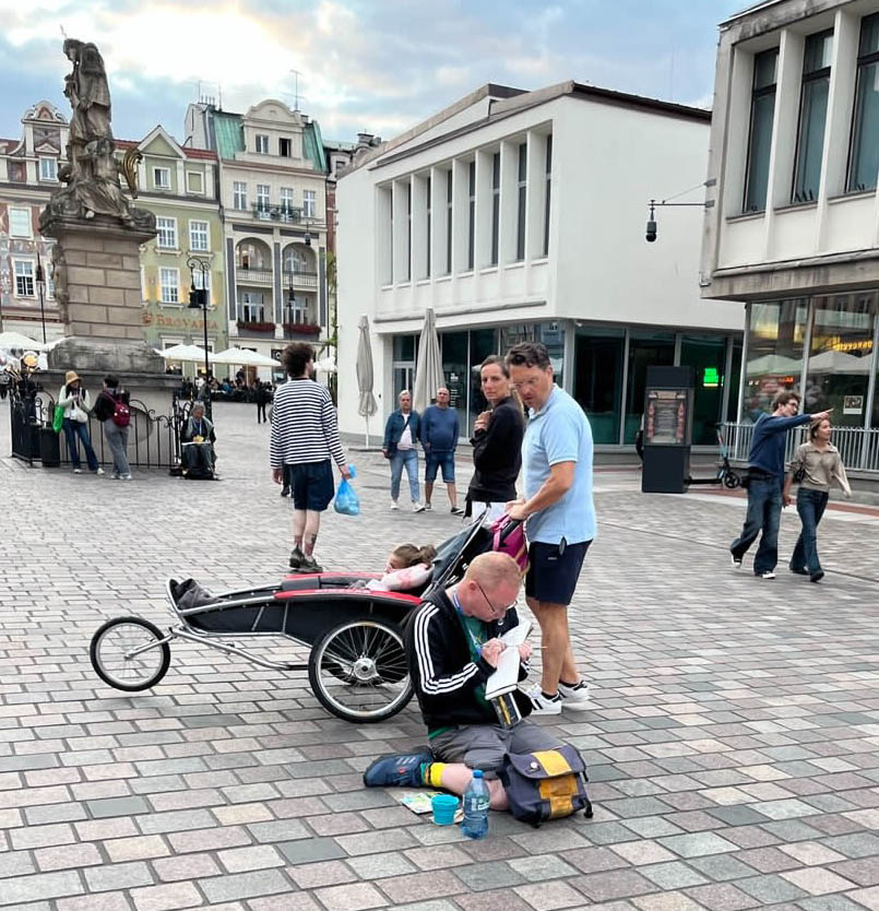 I went a couple of blocks away and stood right in the middle of Stary Rynek, the main square, which wasn’t part of the Sketchwalk route but I’m an urban sketching rebel. Plus I couldn’t find the next location on the map. I wanted to draw one of the rows of colourful old buildings in the main square; see below. I only had 30 minutes before the official end of the Sketchwalk, and I didn’t want to be late, I’m not that much of a rebel. So I went FAST. It may be one of the fastest most detailed sketches I did that day. I didn’t colour it in, except the sky which was pure theatre. I umped into some sketchers I knew, but I was on a mission and once the sketchbook was out I was in the ZONE. I didn’t even notice Rita Sabler took a picture of me sitting on the cobbles when I was adding my paint, oblivious to the man looking over my shoulder looking utterly perplexed or amazed at my sketch. Or maybe he was just thinking “why is he holding his pen like that?” or “wait are those Jurassic Park socks?” (which they totally are by the way).