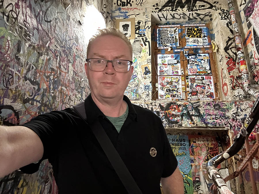 I’ll finish up with the remainder of my Berlin sketches and thoughts. I definitely had a lot of thoughts when visiting the Gedenkstätte Berliner Mauer (Berlin Wall Memorial) in the northern section of the city, close to the Nordbahnhof. before heading up there I walked over to the Hackescher Höfe, which I had visited a couple of days before with Omar. I wanted to visit the art and bookshop there, at the Haus Schwarzenberg, which is covered in graffiti and has a stairwell full of art and posters and stickers (and signs saying not to take photos; I broke that rule). The shop I visited was called ‘Neurotitan’ and was an incredible place, I bought some zines and stickers there, and asked the assistant if they had Detlef Surrey’s book ‘The Wall Revisited’ (I’m pleased to say I held a conversation in German and was totally fine; normally I need a couple of beers before the German comes flooding back). I had heard that this store stocked it, but she said that the last copy had just been sold that day, probably by someone else who had seen his talk in Poznan. I showed her my sketches of that talk, she said that I could probably get in touch with the publisher to get a copy (I did, once I got back to the US, but it took some time and a bit of extra money – thanks a lot, bloody tariffs – to get one sent over to America). I had that book on my mind now especially because I was going up to the Berlin Wall Memorial, which Detlef had talked about at length. I took the U-Bahn out to Nordbahnhof (I realize that sentence implies that I simply got on the S-Bahn, and just went to Nordbahnhof, but leaves out that I got on the wrong train in the wrong direction at least twice, like when you try to fix a scratch but end up smashing up the table, but I did end up at Nordbahnhof in probably more time than it would have taken to walk). The Berlin Wall Memorial is a preserved section of the Wall and the Death Strip, along Bernauer Strasse. It was already early evening when I arrived at Nordbahnhof (sketched below), which during the Cold War was closed down, a ‘Ghost Station’ on the divided S-Bahn system, where West Berlin trains would not stop but passengers would catch a glimpse of a time capsule manned with armed guards. I found the Berlin Wall Memorial chilling. This was not like the East Side Gallery, here was the Wall as it looked, along with rows of metal poles installed like bars you can walk through. One section remains closed off to give an idea of what the Death Strip really looked like. Berlin is a city that dares you not to forget its past. On a metal display in the middle of the grass are the names and faces of every person who was killed trying to escape from the East into West Berlin, 136 in all. The faces as they look out at you, some so young – even children – was frightening. There were blocks occasionally showing where people were shot trying to escape. The Wall was up from 13 August 1961 until 9 November 1989. I didn’t get to see all the areas of the Memorial, nor the documentation center, but I sketched the Wall as the light was fading, then took a tram out to Prenzlauerberg and back to the hotel.
