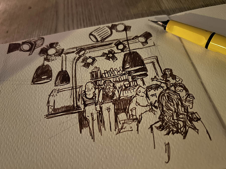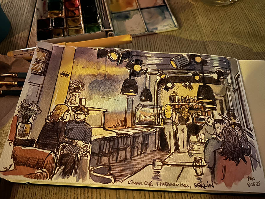 After a late dinner of spaetzle from the hotel restaurant I walked back over to Hackescher Markt. All over Berlin, but especially around here where there had once been a large Jewish population, you find the ‘Stolpersteine‘, or ‘stumbling stones’, which are actually little square brass plaques in the pavement that are slightly raised so that you might trip on them, by design. Each has the names of people who lived there previously, usually Jewish but many Roma, homosexuals, disabled, who were removed or forced to flee by the Nazis, along with the year, how old they were, and their fate (you see ‘Ermordert in Auschwitz’ a lot). This is an initiative by the artist Gunter Demnig started in the 90s, and has now spread to many other cities commemorating victims of the Holocaust. Each of the Stolpersteine is handmade. Berlin makes sure it does not forget. I went back over to Hackesche Höfe and had a beer at the Cinema Cafe, which I sketched in the poor light. It is interesting that a lot of places in Berlin are cash only, where I got so used to using my card everywhere in Poland, same back in California. It wasn’t a busy evening, it was Tuesday, but it was an interesting cafe to sketch, and I used my fountain pen. The outside area of the cafe is in that alley with all the graffiti and would have been an interesting sketch, if I could find somewhere to sit with a good view, which I couldn’t. After this, tired, I went to bed.