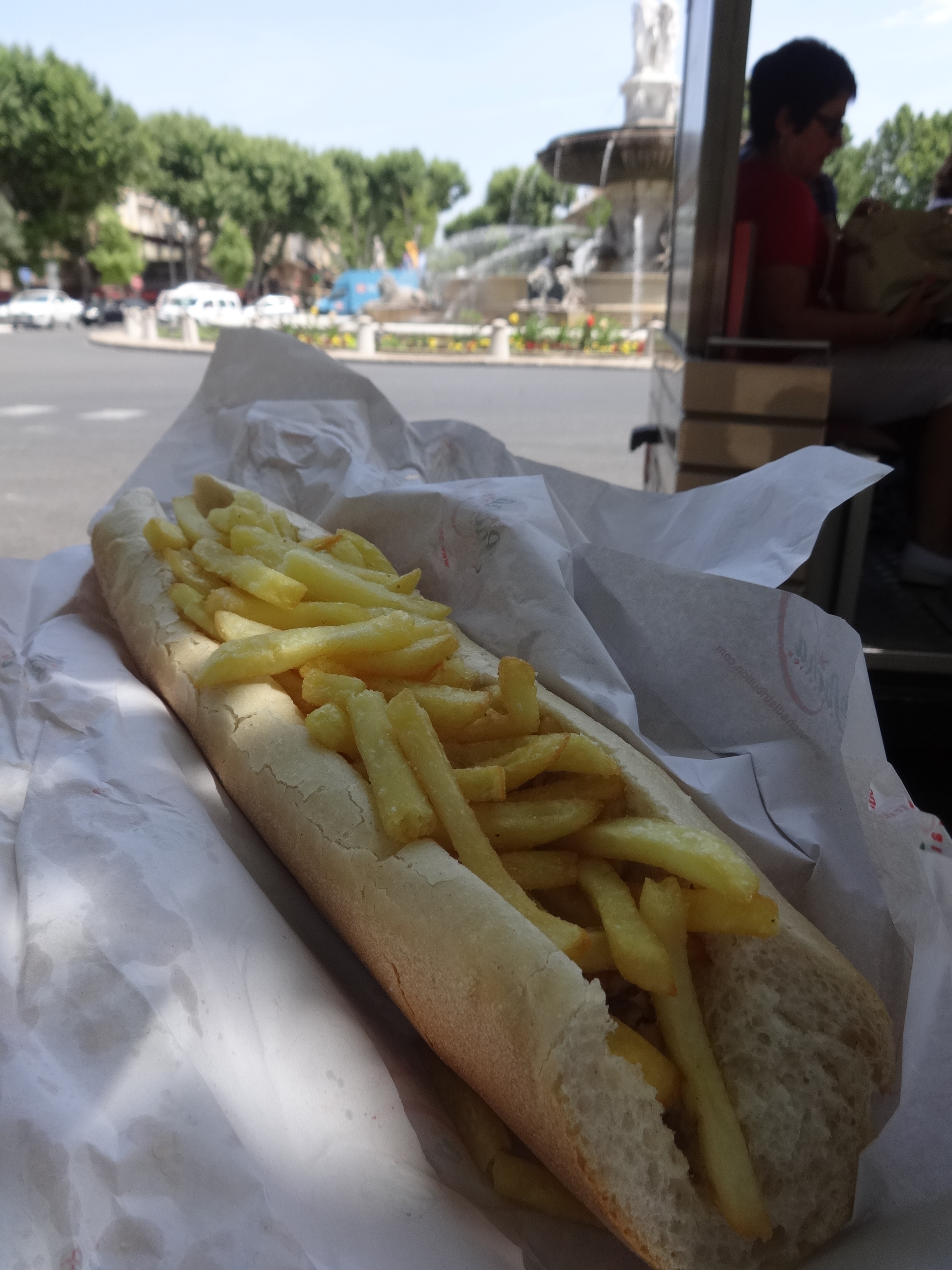 “Poulet-frites”, I hear you say? This was my favourite meal when I lived in Aix. There were a few places I would get them, the best being the little place outside the Super U, but I also liked “Le Regal” as well. Well a decade later Le Regal had moved across the street to a spot outside the post office, significanty upgraded its friterie stand, but still they produce lovely poulet-frites. Poulet-frites is basically a small baguette filled with chicken and the sauce of choice (I love le mayo), then topped off with loads of fresh frites (French Fries to you). Poulet-frites, I love you very much. There is my poulet-frites on the right.