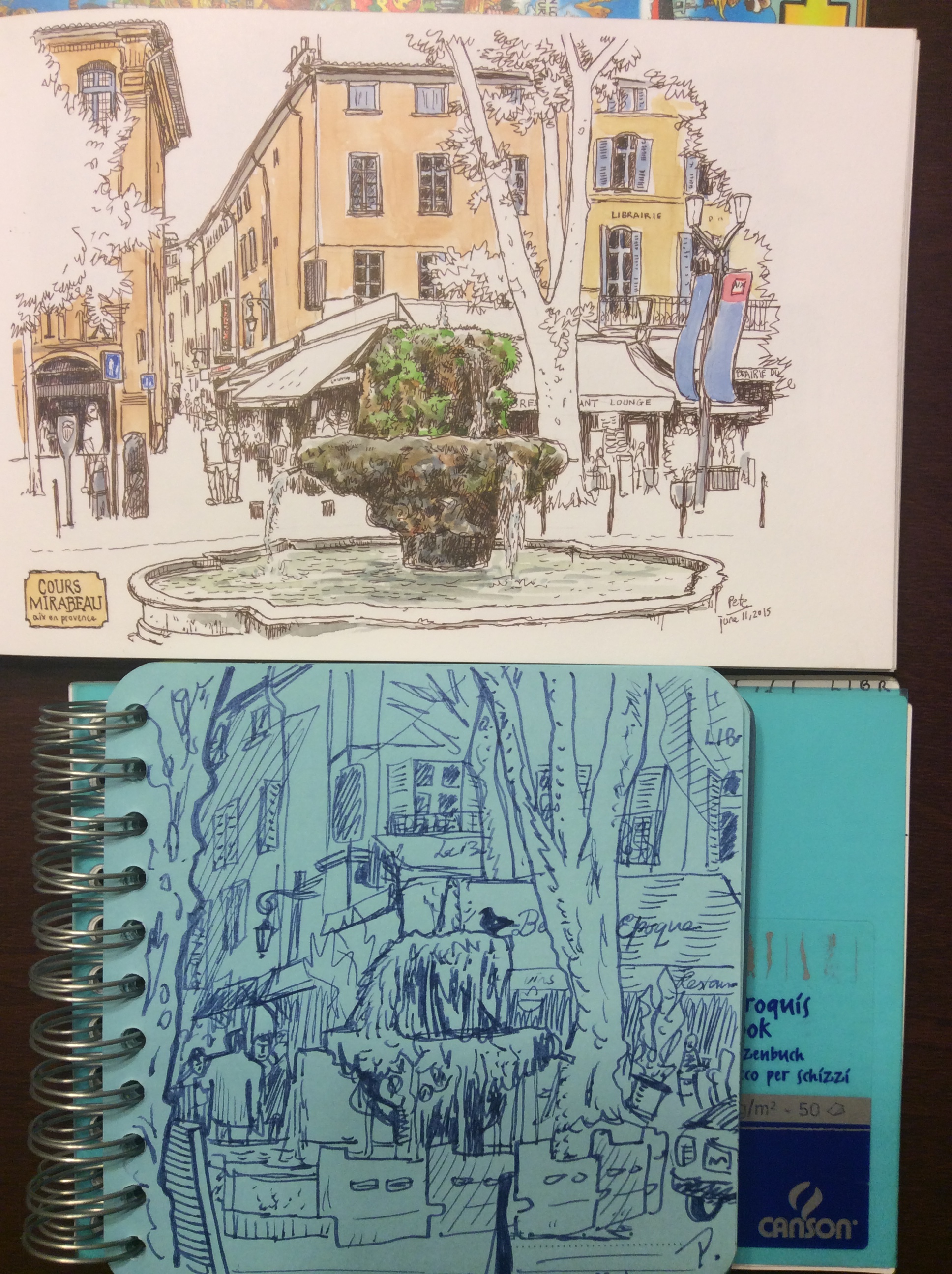 Two sketches of the Fontaine des Neuf Canons, Cours Mirabeau, 2003 and 2015. I liked that blue sketchbook and blue pen at the time (no, it was not my blue period).