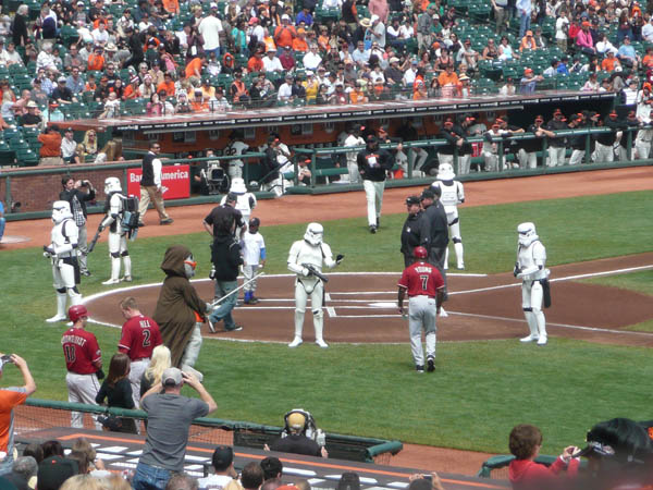 Last weekend, we went on a family trip to the ballgame. It was both mine and my son’s first San Francisco Giants game, though my wife and her mom (big Giants fans) had been earlier in the season, when things had been going a little better for the Giants. This game however was crucial – playing the Arizona Diamondbacks, who were leading in the division, and being several games behind we really needed to win. But that didn’t matter – it was Star Wars day, and the Force would be with us!
