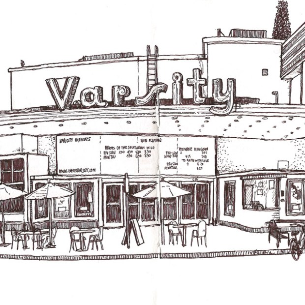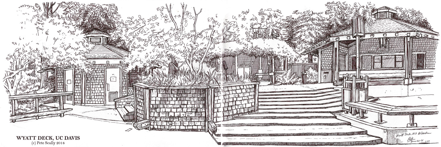 And so, finally back to posting some sketches, if I can even vaguely remember what that feels like. The World Cup is over! Gone for another four years, what will we do? It’s not like there is any other football to watch in that entire time. Haha. I enjoyed going over the kits so much I may even torture you all with more, from the clubs, as many as I can possibly do. Mwahahaha. And football-puns? You ain’t, as they say, seen nothing yet. Oh, alright I’ll lay off the puns for a while, it is pre-season after all. I need to train for a few weeks to get my football-punning back up to match fitness for the new Premier League season starting in August. Expect to see me jogging around the green belts of Davis trying to make punchlines out of Pocchetino and find an angle on Van Gaal (you see? Much training needed). But in this time of world-cup-football-ness, amid all the dodgy haircuts and the acrobatic goalkeeping and the constant non-stop biting (it was only the one bite, wasn’t it?), I did manage to do some sketching. This was a panorama I did over two lunchtimes at the Wyatt Deck in the UC Davis Arboretum. Technically it was three lunchtimes but on one of them I didn’t do any sketching as I forgot my pen (doh!). I had intended to add paint to it as well but I decided I preferred it like this. I listened to a History podcast while sketching and it was a man who was a South American football historian talking (among other things) about the great Uruguay team of the 20s and 30s, the River Plate team of the 50s, and what football meant/means in terms of national identity among the nations in South America, how historically it was able to strengthen their differences while also presenting them with an opportunity to announce themselves globally (at the Olympics and later the World Cup). Very interesting. It’s funny how what you listen to when you sketch gets so involved with how you see the sketch from thereon – none of you will see any reference to Paraguay’s style of play or the founding of great Brazilian clubs by British immigrant workers in this drawing of some wooden buildings at the Arboretum, but I see those great south American football names in every line drawn. Except in the middle, which will always be about Batman, because I was listening to another podcast by that point which talked a lot about the Tim Burton Batman movie. Again, you can’t see that, but I do. Now I always wonder what was really going through artist’s minds when they were creating their work. I look at one of Mondrian’s compositions and I think, I wonder if he was thinking about getting a cat and in between colouring in those squares whether he went down to the pet shop to look at kittens, I don’t know. You don’t know. Or when Van Gogh painted that portrait of himself with no ear, maybe in fact he was listening to his annoying unemployed next door neighbour practicing their singing really badly day in, day out, and he just subconsciously painted himself with no ear without even thinking about it, you just don’t know do you. Or when Damien Hurst was putting that sheep into the formaldehyde, maybe at the same time he was listening to his favourite gardening show on the radio? And now every time he sees that sheep he keeps thinking, ooh I’d better water the petunias when I get home. You just don’t know.