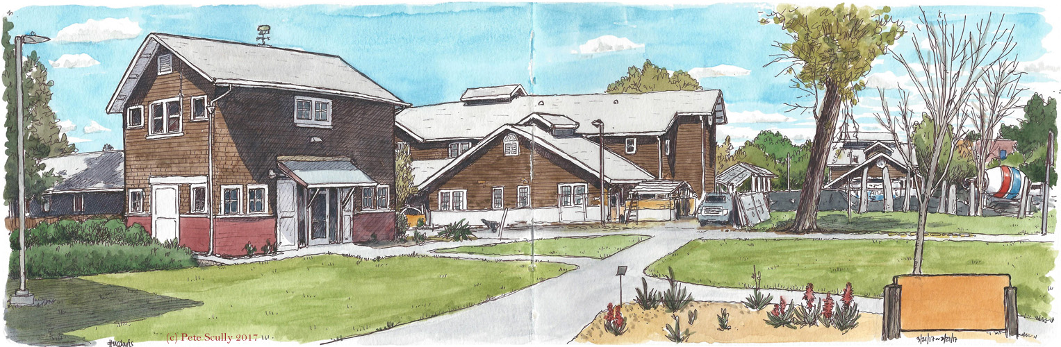 Construction continues at the UC Davis South Silo area. Here’s what it looked like the last time I sketched it in November (aka “OHGODNOOOO!!!-vember”). That roof is really coming along now. Here is what it looked like last August, almost the same view as this one.Those triangular roofs look like a mountain range, or the crests of a cliff face. This sketch is a bit like one of those “puzzles” people post on Facebook, “how many triangles can you see in this image?” Don’t answer it, there are just loads. Honestly. You like all those puzzles and posts though don’t you, those “Can you see the Math problem? Only one in ten can!” and it’s like 10-5 or something, then you realize the problem is the word “Math” but it’s only a problem if you’re British and a stickler (let me just say, I work in the same building as the Math department whereas I work for “Stats”, amusing observation on usage of plurals in the abbreviated form. Look I’m not going to go on about this, you know I would, but it’s late on a Friday night and I’m tired and a bit hungry.) My favourite ones are the posts that state, I’m honestly not making this up, things like “Try to name a Song which has a colour in the title. It’s harder than you think!!” Um, no, it’s really really fecking easy, there are literally millions of songs. Yet you see the comments afterwards, everyone’s coming up with the same “She Wore A Yellow Ribbon” shite as if they have discovered something unique and obscure, well done you, well done, pat on the back, good job remembering the most basic things. Ok, here I go, they’re too easy a target, stupid Facebook posts, I apologize, it’s late on a Friday. Oh but those other ones I hate, “Do you remember [insert name of chocolate bar here]?” And everyone’s like, “yeah I remember those! God that brings me back. Gawd, eating a [insert chocolate bar here] after school, covered in mud, no such things as video games back then, we had hula hoops if we were lucky, eating a [insert chocolate bar here] after saving up my pennies, gawd didn’t have video games and iPods in those days, made our own entertainment, didn’t have immigrants either, etc etc ad infinitum.” You’ll notice that is less realistic than the real thing, on the real Facebook they reach the inevitable immigrant conclusion of their random journey down fake memory lane much more quickly, at least on the FB memory-sharing groups I have seen and subsequently unfollowed. And the funny thing is, that [insert chocolate bar here] is still bloody available! Still in the shops. Those ones are in the category of “do you remember…” posted by people who are actually goldfish with zero memory of anything. “Do you remember Twix?” “Do you remember the sky?” “Do you remember the concept of time and space?” Sorry, sorry, Facebook is too easy a target. Actually I haven’t posted on my Facebook page (petescullysketcher) in ages. It’s probably FB fatigue, we’re all getting that. Undoubtedly it’s also laziness. It’s also because nobody remembers anything when I post “Do you remember…” posts, nobody remembers any of it, like it’s too obscure. “Do you remember … where I put my gloves?” “Does anyone remember … next Thursday?” I don’t really connect with Facebook any more, I don’t really get it. The Next Big Fad hasn’t arrived yet. Wow, where did this stream of nonsense begin? (Skims backwards through the post) Oh right,”Triangles”. How many triangles in this image? I don’t know, it’s late on a Friday night, I really want a chocolate bar, and I can’t remember where I put it, and I’m not asking Facebook, because they can’t remember anything.