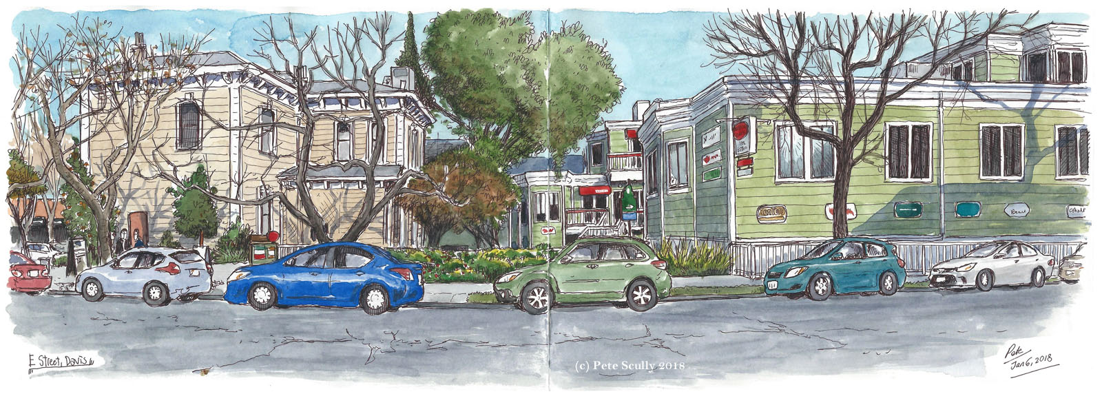 Next up is another view of the side of the Dresbach-Hunt-Boyer Building, which is on the corner of 2nd and E Streets, and is one of the oldest buildings in Davis, dating from the 1870s (and therefore older than the White House East Wing was). William Dresbach lived here, and he is important because he was the first postmaster of what was then called Davisville, a position of such power that it was he who shortened the name ‘Davisville’ to simply ‘Davis’, presumably to save using bigger envelopes. I wonder if it will shortened even further to just ‘Dave’. I think I have been inside the mansion once, when it was an information or visitor’s centre for Davis and I was in there looking for leaflets to include in our student welcome folders years ago. I used to have to do that, go around trying to get useful leaflets. I remember one year going to the Chamber of Commerce (I think it was) when it was on 3rd Street and they refused to give me more than one copy of some downtown map of local attractions and restaurants. A tall serious man came out and stood in front of me questioning why I needed them, as if asking for five or six copies of a free map to give to prospective students was somehow highly irregular; it was a little intimidating. As I skulked away guiltily with just one map, I remember thinking, I hope you don’t ever need a drawing of Davis at any point because I will probably say no. I was so put off I never bothered asking again and ended up making my own information sheets illustrated with my own sketches, I don’t have those any more though as I do a different job now. Anyway back to this sketch, right outside is the real symbol of Davis, a bicycle drawn so badly that it looks like a piece of modern art. It is a strong contender for the worst bike I have ever drawn. When I joke about not being able to draw them I’m not kidding. Notice how I carefully avoided drawing the wheels on that bit of car as well. Remember that kids song, ‘The Wheels On The Bus Go Round and Round’? I could never remember the words, because I just don’t like wheels, I can’t draw circles. I don’t even eat Wagon Wheels. I even get annoyed watching Wheel of Fortune, but for completely different reasons, the latest of which is the new host Ryan C. Crest. Anyway, the green buildings on the right of the sketch are called Mansion Square. Almost twenty years ago, before I had my first job in Davis, I went for a job here at the SAT preparation center as someone that would help students get ready for their SAT. Having no experience whatsoever with the SAT I was not really qualified, and I had to take a mock SAT as well which I don’t think I passed, but I did have to do a presentation about any subject and if I recall correctly I went in and told them all about the English ghost legend of Black Shuck. Fascinating, but completely useless information. Back then, there was a massive tree that stood in the middle of the scene above, probably the tallest tree in downtown Davis, and it was leaning quite considerably to the left so they ended up cutting it down and chopping it up (no that’s not a metaphor, behave). I was worried it would fall eventually and I did draw it once, but now it’s just a memory.