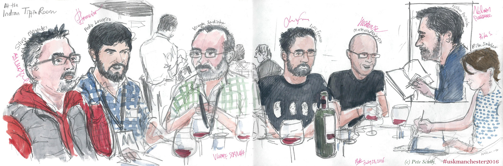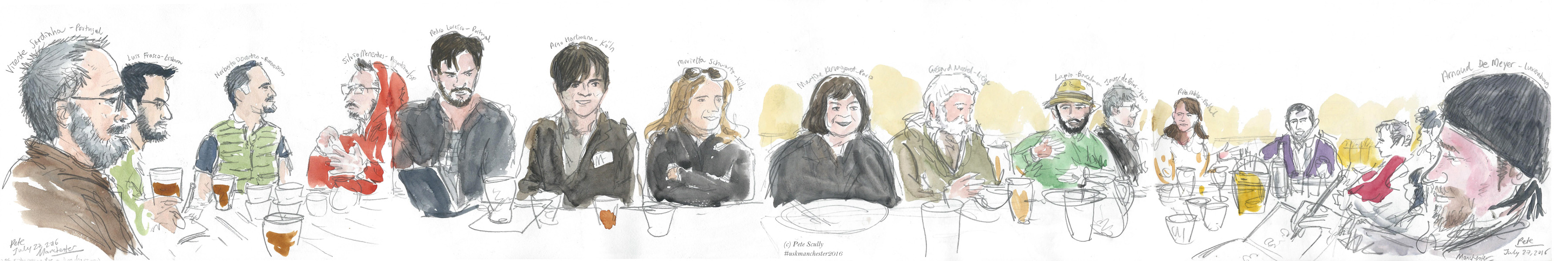 Right, moving on from the Peak District (whenever friends from London say that it sounds like “the Pete District”) I took the road up to the city of Manchester. I first properly visited Manchester during the Urban Sketching Symposium there in 2016, which I really enjoyed, one of my favourite symposiums. I was astonished how sketchable Manchester was, especially the Castlefields area. See my Manchester sketches here. And yes, it rained every day, and I loved it. Sat on the pavement in the rain eating chips in gravy for lunch with a can of orange Tango is up there with my favourite memories. Though it was quite noisy in the area where I stayed downtown, which I think was on the edge of party central; thankfully the bedroom of the apartment I rented had double glazing. I do remember walking past this train station at Deansgate early one evening when I was wandering about lost, looking for the pub where everyone met nightly during the symposium – I had taken a wrong turn, those famous Scully map reading skills not working out on this one occasion. It happens sometimes, I get lost, but hey it’s the only way to really discover. I like drawing railway bridges. Manchester is a famous city you’ve all heard of, football, music, telly; the only time I had been here before 2016 was when I visited the old Granada TV studios with my family back in 1989, and we did the studio tour, seeing the Coronation Street set. My mum loved that show. The old set has now been demolished and rebuilt at the new Granada Studios at Salford Quays.