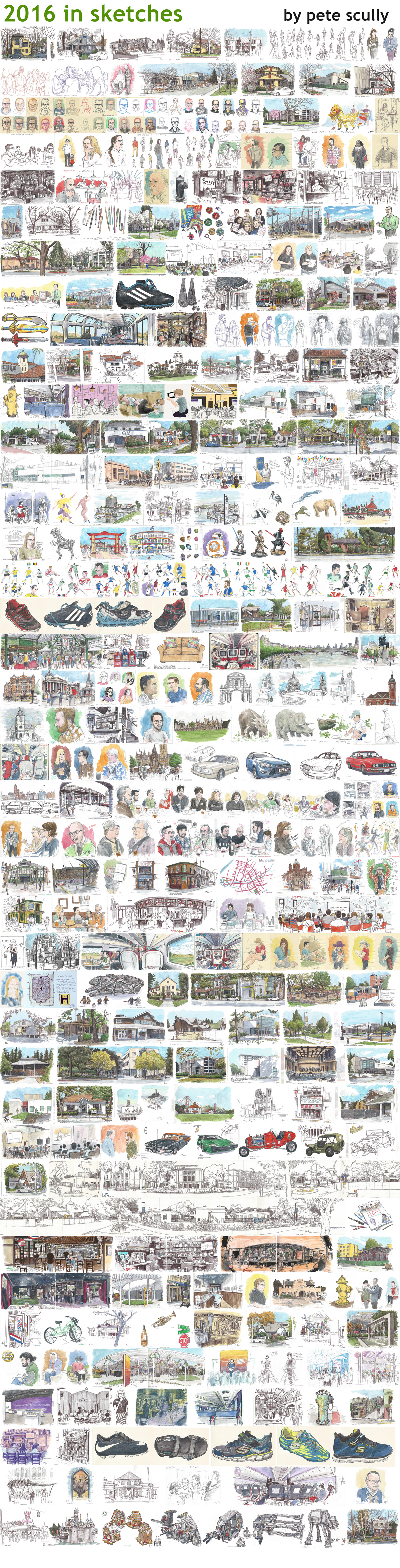 December: Pete Scully, Urban Sketches upstairs at the Pence Gallery. Saved the best one for last, my first solo exhibition at a proper gallery, and it went really well! The artist reception on Dec 9th was especially fun. Many thanks to everybody who came to see my work, and especially to those who bought my drawings.