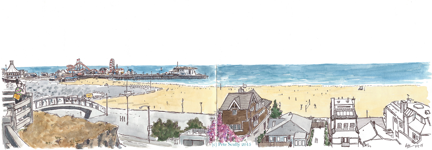 I do like to be beside the seaside. One of my favourite places to be beside the sea is Santa Monica. I arrived on a Saturday afternoon and checked into my motel before walking down to the ocean front. I didn’t actually go onto the beach this time, but I stood up on the bluffs and sketched a panorama of the view looking toward the famous Santa Monica pier. It sure was windy. The sun was shining bright, so I stood beneath a palm tree and did my best. People walked by snapping pictures of them self (if only there was a word for that sort of thing), speaking in all sorts of languages. Behind me, the city of Santa Monica bustled. It was a busy Saturday.