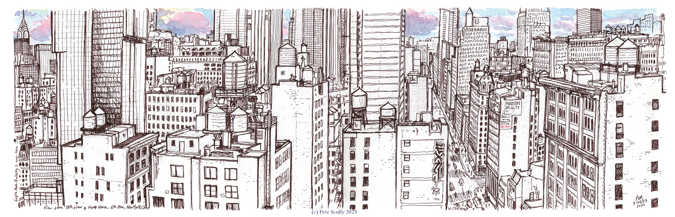The distinctive New York water-towers really are everywhere you look., especially in the view above which was drawn from the roof of our hotel, just a few floors above our room, about 30 stories or more above the street. I was looking south towards the One World Trade Center on the left, and across Chelsea on the right. I was a little overwhelmed by how many water-towers there were, and on another day I might look at the pictures I took and draw a big detailed one, all coloured in. On this day I stood up on the roof of the hotel, which was open to the elements with just an elbow-high glass fence keeping me safe. It was thankfully not too windy. It was late afternoon/early evening, the sky was an interesting collage of shades, and the tall towers in the distance were just blue-grey silhouettes. I drew fast (this took less than an hour and a half) but could not quite finish it, and left a gap which I never had time to fill, and felt that my mind’s eye would fill in the gaps. My eyesight is not that great anyway, and while I sketched one of my lenses actually fell out of my glasses, thankfully falling on my side of the barrier and not hundreds of feet to the sidewalk of 28th Street. I popped it back in. There were taller buildings to my right, and my eyesight was not so bad that I could miss the sight that greeted me there, a man at the window completely, well, ‘stark bollock naked’ as we say and possibly oblivious to the fact anyone could see him at all. I tried not to stare, and thankfully he was not very long. By the window I mean. I think I understand that song about being ‘caught between the moon and New York City’ differently now. I kept drawing (not that obviously) until I could draw no more, and we went for dinner. I was so glad to have the opportunity though to draw New York from above, which is always a dream, and to stay in a hotel where I have the time to actually do it and not feel rushed to leave, even though I still drew faster than usual. New York, all those movies, all those photos, all those paintings and songs and stories, all that culture that has played with our imagination, all right there below me. I want to draw more of it!