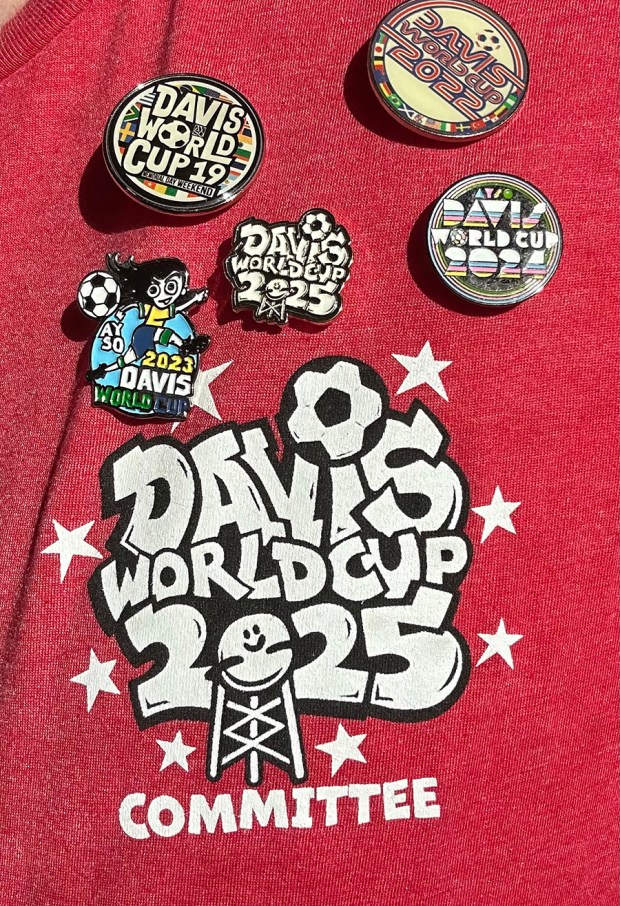 It’s not May in Davis without the annual youth soccer bonanza, the Davis World Cup. I am on the committee for this tournament (I design the logos, medals, pins, t-shirts and I update the website; all the hard work is done by everyone else). The committee has had many of the same members for a number of years now so we’re a pretty efficient team; all our offspring have either aged out or no longer play regular AYSO to even take part in the tournament themselves; I last coached at the tournament in 2018 (with the Spurs!), and my own teenager last played the Davis World Cup in 2019 (for the Dawgs, they were a nice team with a great coach). Above, I sketched all the flags displayed outside the AYSO headquarters in Community Park. This is what I love about the Davis World Cup. Each team that applies (and they come from all over northern California, plus we always get a few from Nevada) gets assigned a country, and they get the flag of that country and are encouraged to offer their opponents little gifts or such associated with that country. So for example if you are Spain, you give a little keyring that says ‘Spain on it, or if you are Uzbekistan, you give a little keyring that says ‘Uzbekistan’ on it, and so on. Actually teams get way more thoughtful and creative than that, giving out candies or trinkets, when my team Spurs played we were assigned as Serbia, so I made little keyrings with ‘Serbia’ on them (along with information about the country and the Serbian alphabet, showing you how to write your name in Serbian). Fun stuff. I coached another AYSO Select team in 2020 (the Titans; I still wear the t-shirt as it was one of my best logos) and I was really hoping (as a committee member) to maybe be able to pick a country for our team, probably Belgium to give out chocolates, probably Ireland due to the family provenance of both coaches, but I really wanted Italy because I was hoping to have the team sing the anthem before each game, they have the best anthem. However, we never got that far because 2020 turned into the 2020 we know and can’t forget, so the tournament was cancelled that year (and I recycled the retro Top of the Pops style logo for the 2022 event). I enjoy making the logo, but I spend an inordinate amount of time faffing about with the design during the year before. I went this year for a more playful design again, using a similar kid-like graffiti style lettering that I’ve used for some of our old teams (like the ‘Duh’, the first AYSO Select team my son played on, coming 4th in the 2017 tournament at U10 level). I went with a ‘splat’ background full of flags, after my friend spilled some milk at a cafe in Nob Hill and I really liked the shape it made on the table. I’ll have that, I thought. So the logo below was born. It was a hit with the t-shirt vendor. I got very excited when I first drew the little cartoon water tower on my iPad, and abandoned the cartoon cow theme I was originally going with. Maybe I’ll resurrect that for next year, if I don’t go with a classic retro World Cup style again.