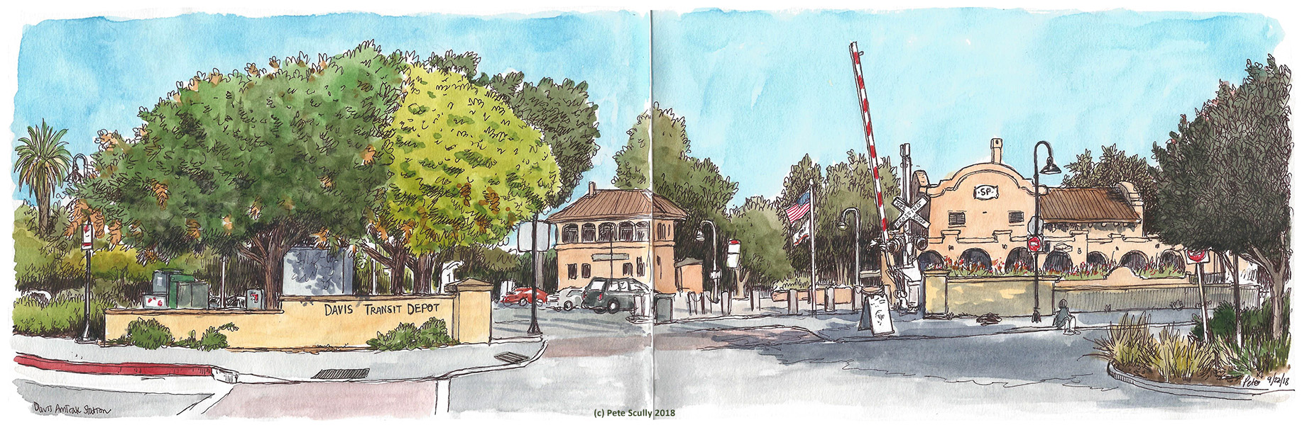 In August I took the morning off work and went to Sacramento for a small medical thing, my wife drove me there. It took a little longer than expected so I had to get the train back to Davis, but there was quite a long wait for the train (so I ended up taking most of the afternoon off too), so I sat outside the station in the shade of a big tree and tried to draw the old Sacramento Valley Station, which I’d never drawn before. It’s a grand old structure dating from 1926, and is the end of the line for the Capitol Corridor route which goes down to the Bay Area. I had quite a long wait (there were two hours between the train that I had missed and the next one) although it’s a bit of a schlepp to the platform, takes a decent ten minutes to walk. Ok maybe a couple of minutes less but you have to hurry. I did add the paint and some of the window shading later though. I like to draw train station exteriors, I’m building up a collection of those as well now. One thing I love to do is travel by rail. I often dream of taking one of those really long train trips across the country, the ones that take several days, but who has the time for that now. The closest I did was the long train ride down from Davis to Santa Barbara, which was on Amtrak’s Coast Starlight train, the epic journey from Seattle to Los Angeles. That was a fun experience, though I wasn’t an overnighter unlike many others. You can see the post from that trip here: https://petescully.com/2016/05/19/rails-whales-and-tales/. There are many train journeys in Europe I still want to take as well, like that steam train in Scotland through the Highlands, and I’d really love to take that bullet train across Japan. I just like trains.