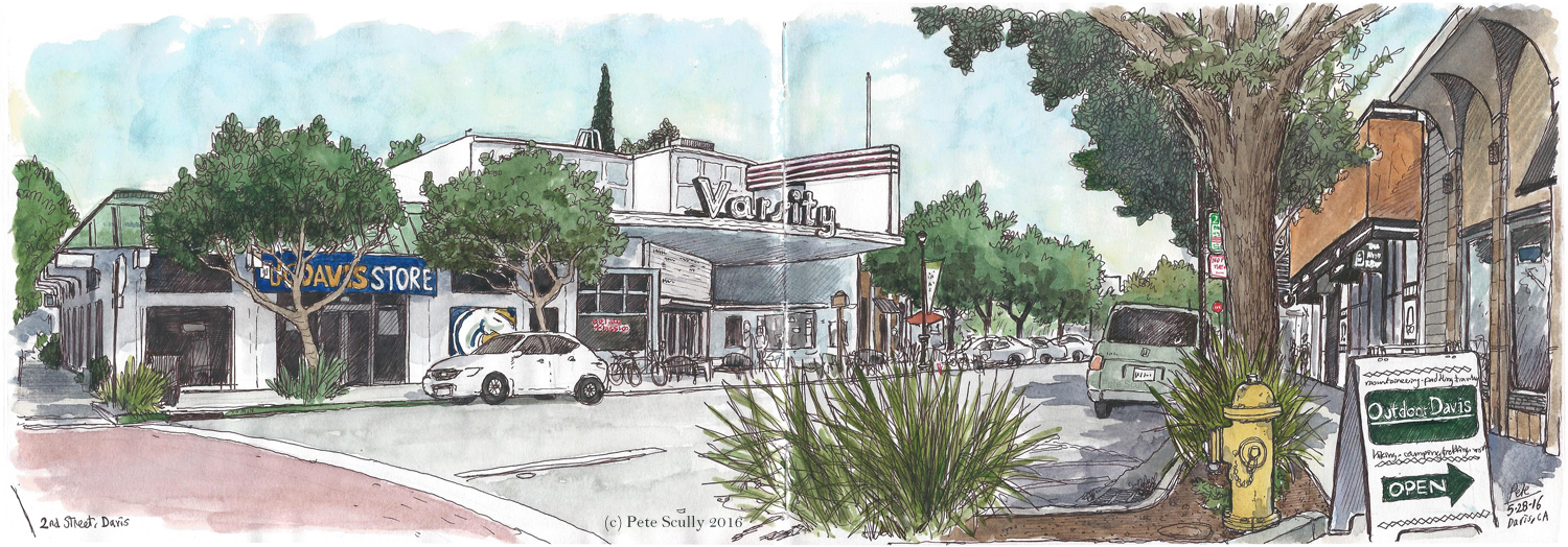 You can’t have a series of downtown sketches without the Varsity Theatre slap bang in the middle of them. I spent the whole of the Sunday out there drawing, finishing off at home with the colour and hatching, and was quite tired by the end of it. You can see the poster for Deadpool and Wolverine in this picture in a couple of places, I had been to see that on the Saturday; fun, very silly, very violent. As you can see I’m using street signs and trees as dividers between the pictures. That’s something I did in the original 2010 accordion book. I think I’ve drawn the Varsity about 21 times now. I need to do an itemized list of which places in Davis I have drawn the most, and keep it like a league table.
