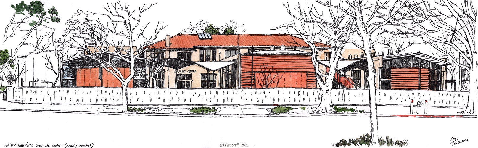 They are nearly done with Walker Hall, the new Graduate Center at UC Davis being built inside the completely renovated and changed older building in the middle of the UC Davis campus. I’ve been drawing it for a few years, though obviously not much in the past few months. I will get down there again soon. In 2020 I only managed these two sketches, one on the iPad and one in the sketchbook. There are only so many angles I can draw and draw again, looking in from the outside, but you can really see the changes now. The glass is being added to the windows, signs being put up around it to let everyone know what this will be, it will really make a difference to this part of campus, just as the impressive Student Community Center next door has done.
