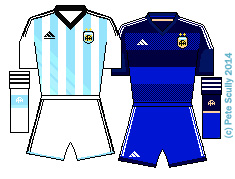 • ARGENTINA : (Adidas) argentina 2014Controversial. For the first time ever, Argentina have decided to go with white shorts instead of black as their official home shorts – as have Germany, as you’ll see. Sure they’ve been made to wear white shorts before (1990 World Cup I think) but it was not the official combination. Still…it doesn’t actually look bad. The home shirt (with it’s black trim!) looks nice, the blue stripes being graded lighter at the bottom to apparently make them look like a flag in the wind (what?). But lack of black shorts? Controversial. I’m surprised Maradona hasn’t gone on TV saying it’s a Malvinas-based conspiracy by FIFA and the Sunday Mirror. I suppose we can blame Adidas. They’ve done this a few times this World Cup, as you’ll see. I love that graded blue away kit though, one of the top five in this cup.