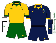 AustraliaThe Socceroos are more regulars now than wannabes, increasing the English language quota at the World Cup now that the USA and Ireland have stopped qualifying (not to mention Scotland and South Africa, and well it’s been a while for Wales, Northern Ireland and Canada, though New Zealand came close). Lots of other countries speak English though, but this year the most widely spoken language (official language of most countries in the World Cup, not number of speakers) is of course Spanish (8 countries), followed by Arabic (4 countries). French is next (France, Belgium, Switzerland, Senegal), and then English with 3 countries having it as an official language (England, Australia and Nigeria). Australia play in a golden yellow with a dark green trim, just like their far more famous rugby union team. I love it when countries have kits that are different colours than their flag, which I have always felt to be a boring way of choosing a kit. Italy for example playing in azure blue, the colours of the House of Savoy; the famous Dutch oranje (orange); Germany’s traditional white home shirt and green away shirt; Malaysia’s distinctive yellow and black; Japan’s classy Samurai Blue;  New Zealand’s All Whites (or All Blacks for rugby). This year’s Nike kit has a distinctive design on the arms; my pixelated drawing makes it look like zebra stripes but it really is nothing like that, it was the best I could do in MS Paint doing each pixel by hand. The away kit is dark green with a light green flash going up and another going down, for some bloody reason. PREDICTION: Bottom of the group (or ‘top’ if you look at it from an antipodean point of view).  KIT: 6/10 home, 5/10 away.