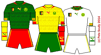 • CAMEROON: (Puma) cameroonThe Indomitable Lions have one of the most vibrant kits at this cup, with a very busy pattern that has their nickname repeated throughout. It’s just a shame the team were not as busy on the pitch. I’m surprised Puma didn’t make nice long pockets on the shorts for the players to safely stash their bonus cash. The yellow second kit has the same pattern, while the white 3rd kit was, let’s face it, a bit hopeful. Cameroon have a fun kit history though, always good for some innovation. Remember the full bodysuit one with the lion-claw slashes on the side? And who can forget the sleeveless top from over a decade ago, that looked like a basketball top, which FIFA said they couldn’t wear at the World Cup. They had to sew on black sleeves. Shame, it was a classic.