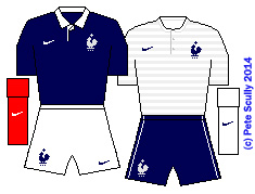 • FRANCE: (Nike) franceAnd then Nike comes up with far and away the BEST kit of the tournament. So good in fact, I just had to buy it. Allez les bleus! I must say that while Adidas and France seemed so natural for so long, during their waning years the French Adidas shirts were looking ever more desperate. As were the on-field antics of the team. When they switched over to a nice, clean Nike outfit it was like a breath of fresh air. This now is their third one so far, and their best, a classic rugby-shirt style top in navy blue, white shorts and red socks. Rugby is very popular in France so this feels pretty natural. The away kit has the mariniere look but with muted grey hoops. The FFF have also gone for the more olden-days badge reminiscent of the Just Fontaine era, making this look more like an old Tottenham shirt. And it feels really nice to wear as well. I’ve never been a massive fan of L’Equipe de France, but I used to avidly read France Football when I lived over there and I love this kit so much. So it’s time to dust off the Johnny Halliday song from 2002 and sing, “Allez Les Bleus, On Est Tous Ensemble!” Though unfortunately, they never got to wear the whole ensemble, being made to wear navy shorts with the home shirt each time at the World Cup. As Del Boy would say, “Cordon Bleu!”
