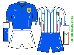 • GHANA: (Puma) ghanaI do like Ghana’s kit. Made by Puma, who have been producing some incredible individual African kits over the past few years, this is another which blends in Ghana’s colourful culture with the classic white kits of the famous Black Stars, so popular during the 1960s hey-day. Ghana have had a great if aging group of players for a while now and I’ve wanted to see them progress in world football, but this year it was not to be. Their home kit though has colourful touches on the collar, and a nice patterned red away kit.