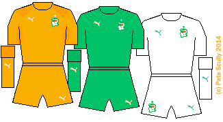 • IVORY COAST: (Puma)  ivory coastOrange isn’t unique to the Dutch. The Ivorians of Cote D’Ivoire – aka the Elephants – have a plain orange outfit with some little orange details on the shoulder, a design which is repeated in the green away kit. They get a white third kit, a many teams do, in case FIFA start crying that they can’t tell the difference on their ancient black and white TVs.