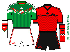 IranIn the last World Cup they had this Uhlsport kit (I think it was Uhlsport) with an Asian Cheetah design and this year they have switched to another adidas template, pretty bog-standard. I’ve said this twice now. In 30 years time they will probably look back at these templates and go oh that was a classic wasn’t it, remember those templates, so cool and clean and classic, a bit like how we look back at some of the less interesting 1990 World Cup shirts now, like retro masterpieces. Iran are a decent team. They were unbeaten in the Asian qualification groups, only letting in 5 goals in 18 matches. Consider that my AYSO Select U10 team recently let in 99 goals in 29 matches and you get an idea for how good that record is. They are a little unfortunate to get Spain and Portugal in their group because otherwise I’d give them a shot. PREDICTION: Third in the group. KIT: 1/10 home, 1/10 away.