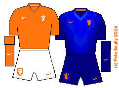 • NETHERLANDS: (Nike) netherlandsOrange is the new Orange. This is a very simple design from the Oranje this time around, nothing interesting but it is clean and thankfully not all one colour, with the white shorts (though all-orange was worn three times, which I think looks a bit too much like a Tango-taste-sensation, Tony). The proper outfit eventually came out against Argentina in the semis…ah yes, they lost that on penalties. The away kit got a couple of outings, an all-blue number in varying shades, which was bloody difficult to reproduce in MS Paint, I do hope you appreciate that one. This was forever be the kit worn when Robin Van Persie scored that header as they destroyed Spain.
