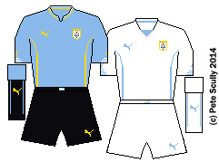 • URUGUAY: (Puma) uruguayThe collar of La Celeste’s famous sky blue home shirt looks as though a bite has been taken out of it, can’t imagine who’d do that. Yes there really is only one thing that can be talked about with regards Uruguay in this World Cup isn’t there, and it’s such a shame because they could have been so much better. They did well to get out of the groups after all. The Puma kits were pretty nice, with a cool little Uruguay flag-inspired bit on the arm. “Bit on the arm?” Oops, slip of the tongue there.
